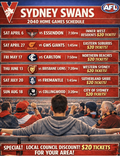 Fig 3.1 prompt: generate me an image of an AFL sydney swans games schedule and include a heavily discounted rate for each council area of sydney home game.