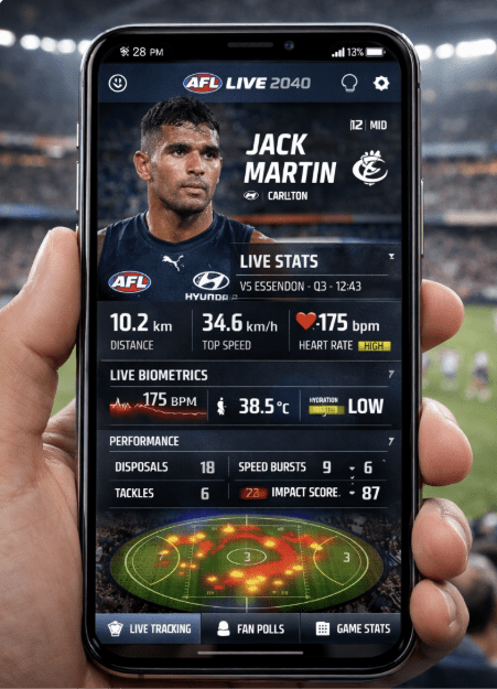 Fig 2.3 – Real-time player analytics in the AFL Live app in 2040 (Chat GPT)